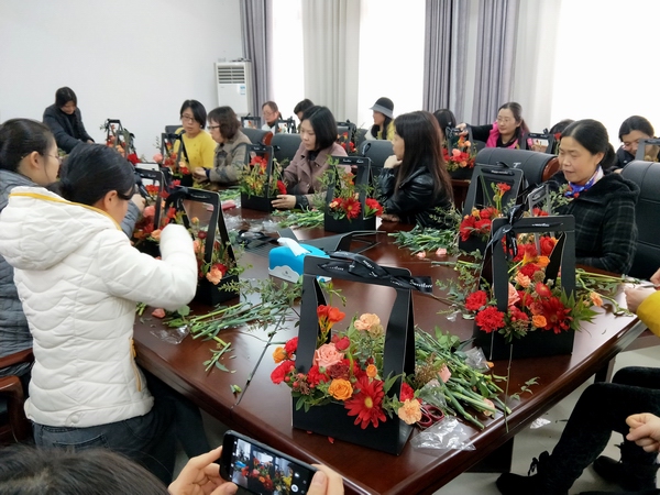 我市专业花艺师荷月老师为女教工们讲授了插花艺术的基本知识,重点介绍了插花的造型、色彩的应用、花材的搭配等,并现场进行了插花展示,指导学员制作插花作品。在轻松愉快的氛围中,学员们从取材、剪枝、构图开始,按步骤完成了各自的插花作品。经过2个小时的培训和亲手实践,在老师的精心指点下,一盆盆错落有致、生机盎然的插花作品展现在了大家眼前。大家看着自己精心制作的艺术品,脸上绽开了花一般的笑容,互相欣赏评点着彼此的作品,非常有成就感。